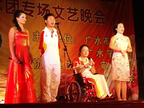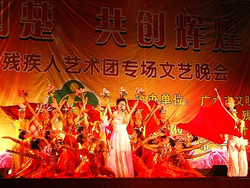 在《我爱你中国》气势恢宏的旋律中,文艺晚会拉开了序幕。曾经荣获第四届全国残疾人汇演一等奖的《心弦》拉近了观众和演员的距离,一句“我多么想叫一声妈妈啊”打动了在场的每一位观众;《我们一起走过》让我们认识了在北京残奥会上创造了2金2银1铜辉煌成绩的“无臂蛟龙”何军权和感动温家宝总理的“轮椅天使”董明,他们感人肺腑的事迹,给台下的观众带来了心灵上的震撼,而舞蹈《千手观音》更是将现场的气氛推到顶点。晚会高潮迭起,像曾获得第七届全国残疾人汇演一等奖的舞蹈《哎呀,我的哥》、曾获得第五届全国学生艺术汇演一等奖的二胡独奏《二泉映月》等节目都十分叫好。残疾人艺术团的演员们踩着心灵的节拍、生命的鼓点,精彩的演出赢得了一次又一次雷鸣般的掌声。
