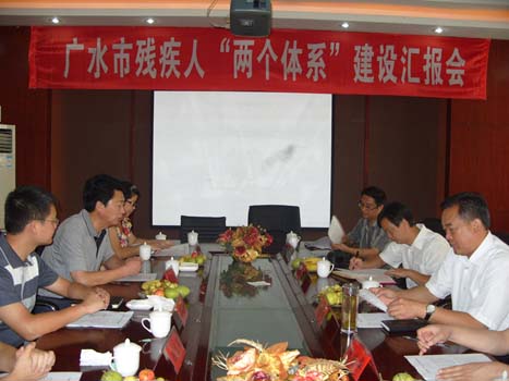检查组一行听取了广水市政府关于残疾人“两个体系”建设推进情况的工作汇报,详细了解了 “两个体系”建设的推进情况。广水市始终把残疾人“两个体系”建设作为促进和谐社会建设、人人享有社会公平和民生保障的关键举措来抓,纳入经济社会发展规划全力推进,取得了较大的进展。残疾人事业经费投入进一步加大,残疾人社会保障水平进一步提高,残疾人服务体系运作机制进一步完善,全市上下抓残疾人“两个体系”建设的合力进一步增强。